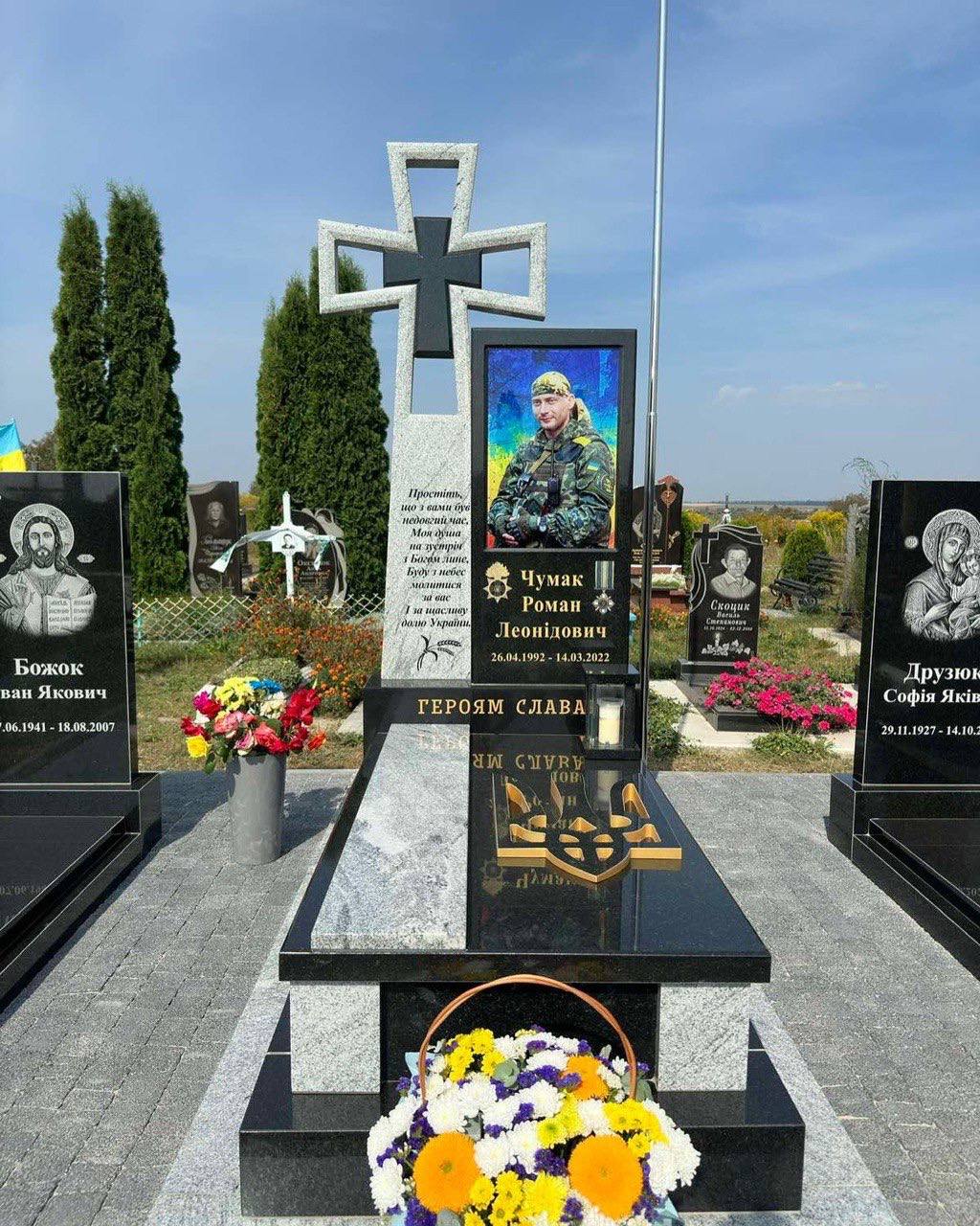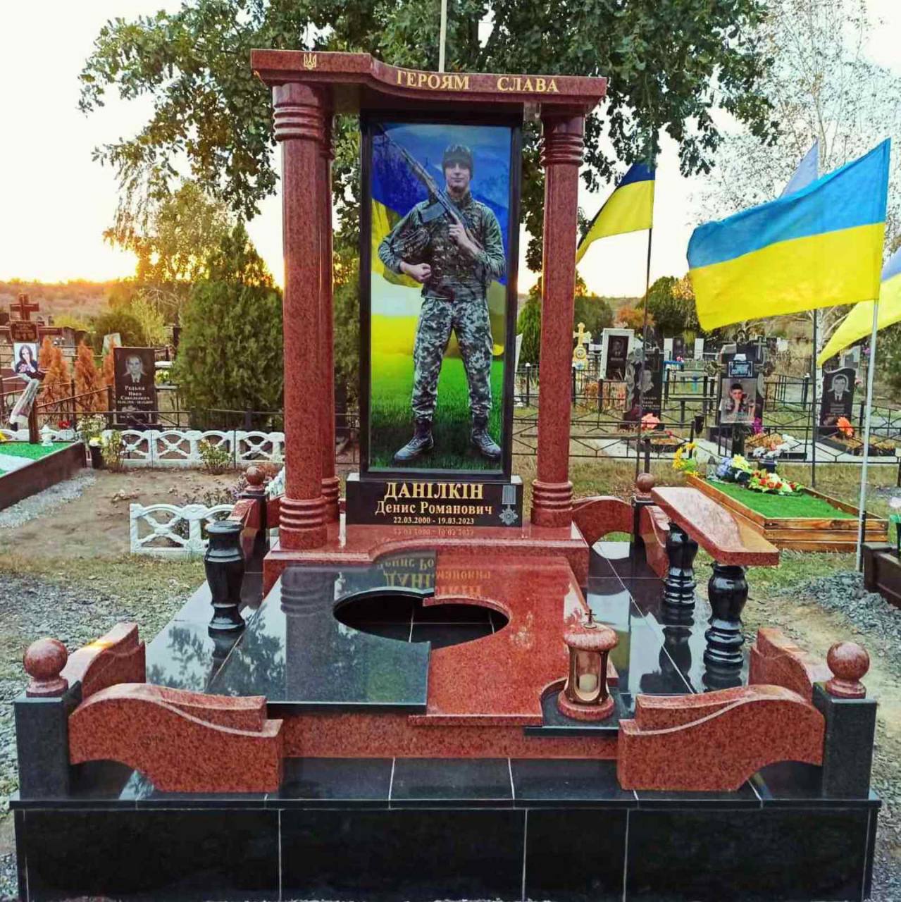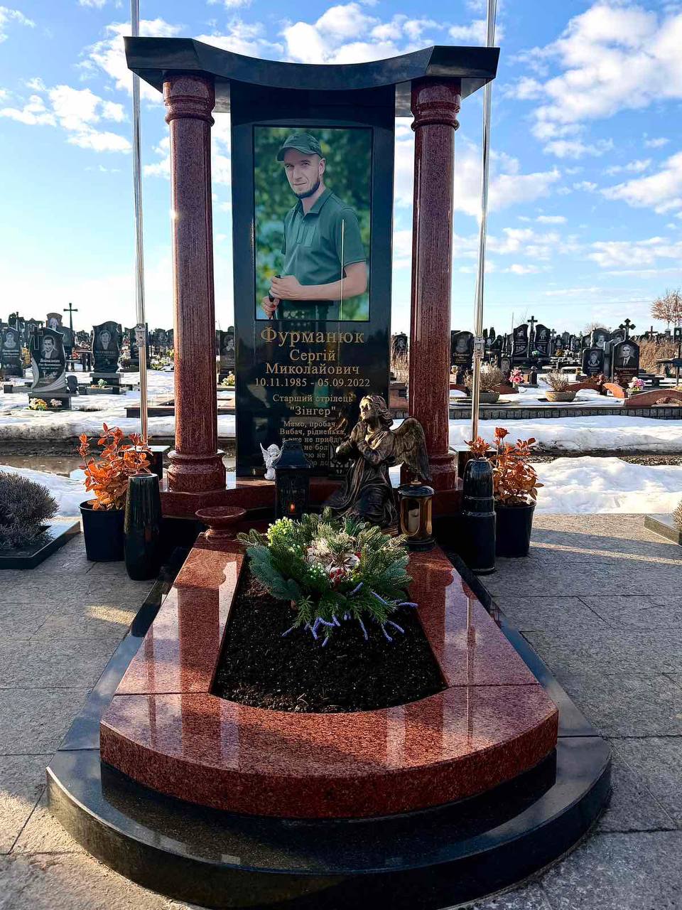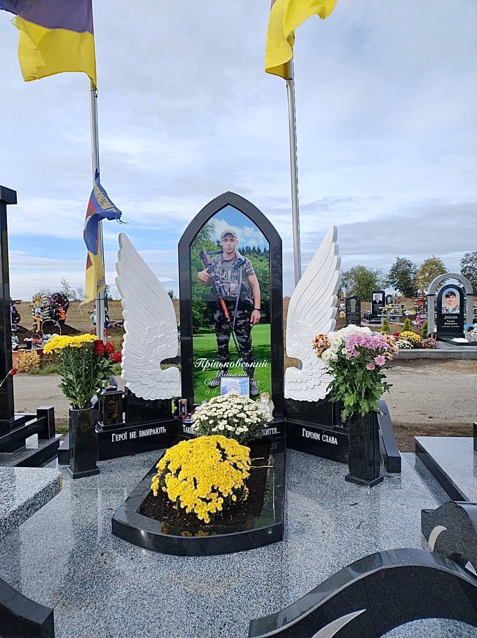 Цей пам’ятник виконаний із поєднання темного й світлого граніту, що створює виразний контраст і надає композиції глибини. У центрі — портрет військового на тлі національних кольорів, а з обох боків його ніби огортають великі крила, символізуючи захист, свободу й вічний спокій. Лаконічна, але потужна форма підкреслює мужність і гідність людини, якій присвячено меморіал. Уся композиція виглядає як символ світлої пам’яті, що підноситься над земним болем.